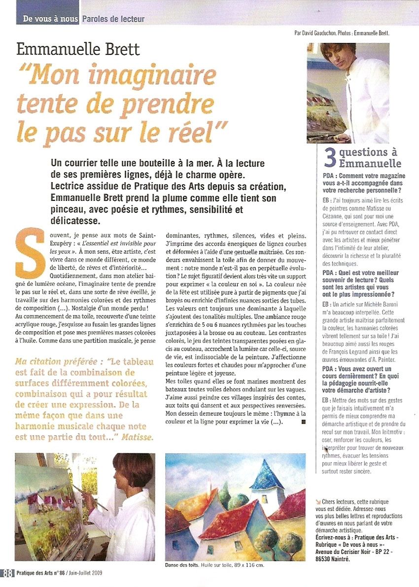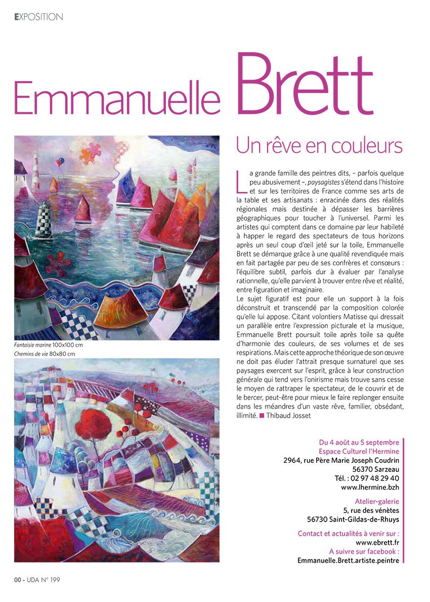 L'exposition d'Emmanuelle Brett est une invitation à entrer dans un monde imaginaire, un rêve éveillé, loin des réalités parfois moroses du monde qui nous entoure. Un cheminement dans des paysages aux harmonies colorées, où les villes se parent de formes tout en rondeurs et les champs de couleurs chatoyantes. Un monde onirique et féérique qui réinvente une réalité rêvée au gré de compositions joyeuses et rythmées. Ce sens de la composition est une des marques de la peinture d'Emmanuelle Brett. Comme dans une partition musicale, elle pense dominantes, rythmes, silences, vides et pleins, avant d'apposer ces lignes et courbures qui donnent mouvement et vie à ses paysages.La couleur composée, d'infinies nuances, vient enrichir le sujet, lui donner ses contrastes et parfaire l'harmonie du tableau.