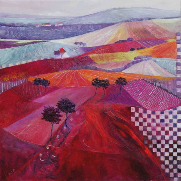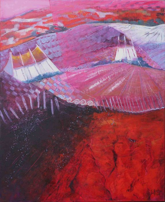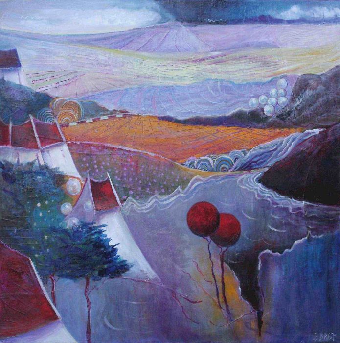 L'exposition d'Emmanuelle Brett est une invitation à entrer dans un monde imaginaire, un rêve éveillé, loin des réalités parfois moroses du monde qui nous entoure. Un cheminement dans des paysages aux harmonies colorées, où les villes se parent de formes tout en rondeurs et les champs de couleurs chatoyantes. Un monde onirique et féérique qui réinvente une réalité rêvée au gré de compositions joyeuses et rythmées. Ce sens de la composition est une des marques de la peinture d'Emmanuelle Brett. Comme dans une partition musicale, elle pense dominantes, rythmes, silences, vides et pleins, avant d'apposer ces lignes et courbures qui donnent mouvement et vie à ses paysages.La couleur composée, d'infinies nuances, vient enrichir le sujet, lui donner ses contrastes et parfaire l'harmonie du tableau.