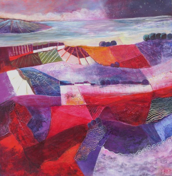 L'exposition d'Emmanuelle Brett est une invitation à entrer dans un monde imaginaire, un rêve éveillé, loin des réalités parfois moroses du monde qui nous entoure. Un cheminement dans des paysages aux harmonies colorées, où les villes se parent de formes tout en rondeurs et les champs de couleurs chatoyantes. Un monde onirique et féérique qui réinvente une réalité rêvée au gré de compositions joyeuses et rythmées. Ce sens de la composition est une des marques de la peinture d'Emmanuelle Brett. Comme dans une partition musicale, elle pense dominantes, rythmes, silences, vides et pleins, avant d'apposer ces lignes et courbures qui donnent mouvement et vie à ses paysages.La couleur composée, d'infinies nuances, vient enrichir le sujet, lui donner ses contrastes et parfaire l'harmonie du tableau.